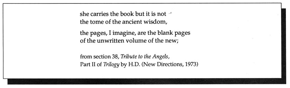 Everyday's an experiment in livelihood: working outside an institutional center. How to stay alive in unauthorized, freely moving language? Speaking to & with each other. Somehow--invent without ending. HOW(ever) appearing now for eight years against a much greater likelihood of "blank pages": the unprinted & uncirculated--leaves something in motion, like the images H.D. reads: "inevitably a shadow, a writing-on-the-wall, a curve like a reversed, unfinished S and a dot beneath it, a question mark, the shadow of a question. . . "