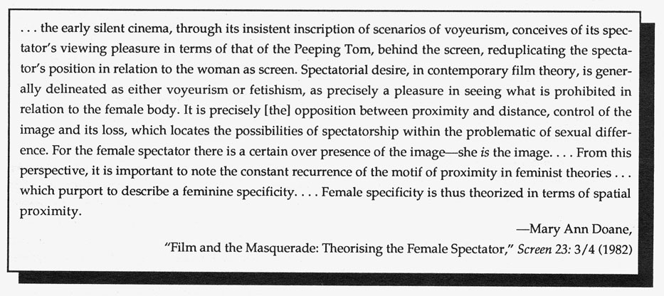.endnotes Editor's Notes: What is this urgency toward the hieroglyphic--to say, to gesture at--that leaves this issue riddled with "multiple meaning ideograms?" If, as Doane suggests, "It is precisely the opposition between proximity and distance, control of the image and its loss. . . " which makes spectatorship gendered; and if, as she also suggests, "For the female spectator there is a certain over-presence of the image--she is the image. . ."--then spatial proximity to the screen, to the page, is everything. The emphasis on place, placement, in this work is consistent. An idea as a pattern or plan or place: using the space on the page as a camera uses light--as punctuation and abbreviation. She is not the screen, or on it, she is between what Eisenstein calls "the syntax of inner speech" and that of "uttered speech." The work in this issue insists that we dissemble words and read the alphabet as a series of caught acts--each letter a carved abbreviation, a taking of place.