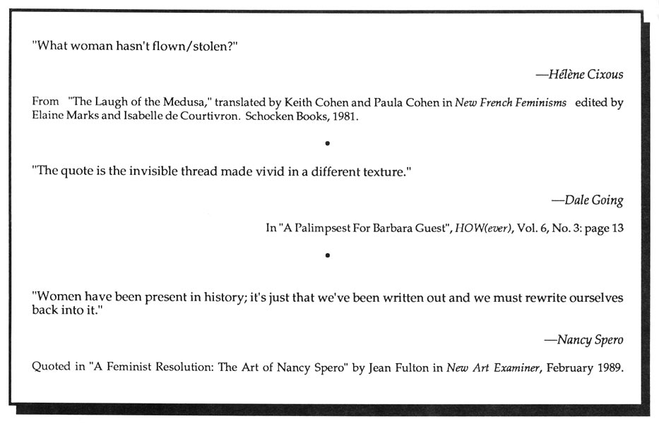 Revisions to our most recent issue, Vol. VI, No. 2: "A Force of Language", Beverly Dahlen's extended review of It Then by Danielle Collobert (translated by Norma Cole) appears in Sulfur 27, Fall 1990. An additional translation of Gertrude Stein's Tender Buttons has been brought to our attention: a 1988 publication by Professor Hisao Kanaseki, specialist in American Studies at Tokyo University. An interest beyond the irony of postmodern pastiche moved us to track other soundings of quotation. New writing that incorporates or splices material to re-activate or re/place its sources. Subversion of claims of property & what's proper. Toward an archeology of breath - quoting what has been left un/re/marked. Quotation as a kind of question-marking -- cultural activism that may transform or illuminate (x-ray) the "original".