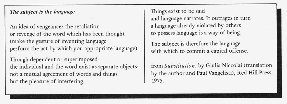 this summer. The book includes a sixty-four-page selection of poems written over the last four years. It will cost $6.00 (plus $1.00 for postage and handling), and may be ordered from HOW(ever) Press, 554 Jersey Street, San Francisco, California 94114, and from selected local bookstores featuring small press publications.