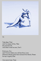BIO: Francie Shaw and Bob Perelman are married and live in Philadelphia, where she is an artist and he teaches at the University of Pennsylvania. His most recent book is Ten to One from Wesleyan. Granary Books will publish Playing Bodies in the spring of 2003.