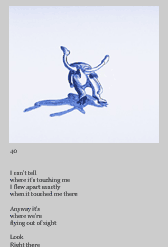 Working Note: Exploring the space where terror and comfort, pleasure and pain are overlaid, I have done a series of 52 paintings using three small figures, two per painting, in various provocative and ambiguous poses. The figures are familiar toys: a bendable person (either a male or a female), and a plastic dinosaur. The paintings are done in a light style similar to ink brush drawings, in blue paint on high gloss white, reminiscent of Delft tiles. The paintings are metaphorical in that each gesture or pose suggests an often contradictory variety of emotional meanings. The relationship displayed can be read as between 2 figures or between different parts of oneself. At the same time they are clearly paintings of toys. The 52 paintings as a whole do not form a progression; instead, each painting poses a variation of some basic question: is this play or struggle, or both at once, who is carrying whom, who is in control? When displayed as a whole I hang them in a line of two then one then two again to interrupt any particular narrative. (FS)